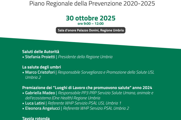 Il programma è coordinato dal servizio Salute umana, animale e dell'ecosistema (one health) della direzione Salute della Regione e dalle aziende Usl Umbria 1 e Usl Umbria 2 e si basa sul modello Workplace Health Promotion dell'Organizzazione mondiale della sanità volto a contrastare le malattie cronico-degenerative attraverso la promozione di stili di vita sani. Le 23 aziende premiate hanno adottato, nell’anno 2024, l'approccio “total worker health”, impegnandosi a creare un ambiente che favorisca attivamente: la corretta alimentazione, l'adozione di uno stile di vita attivo e l'attività fisica regolare, il contrasto ai fattori di rischio quali fumo e consumo scorretto di alcol.