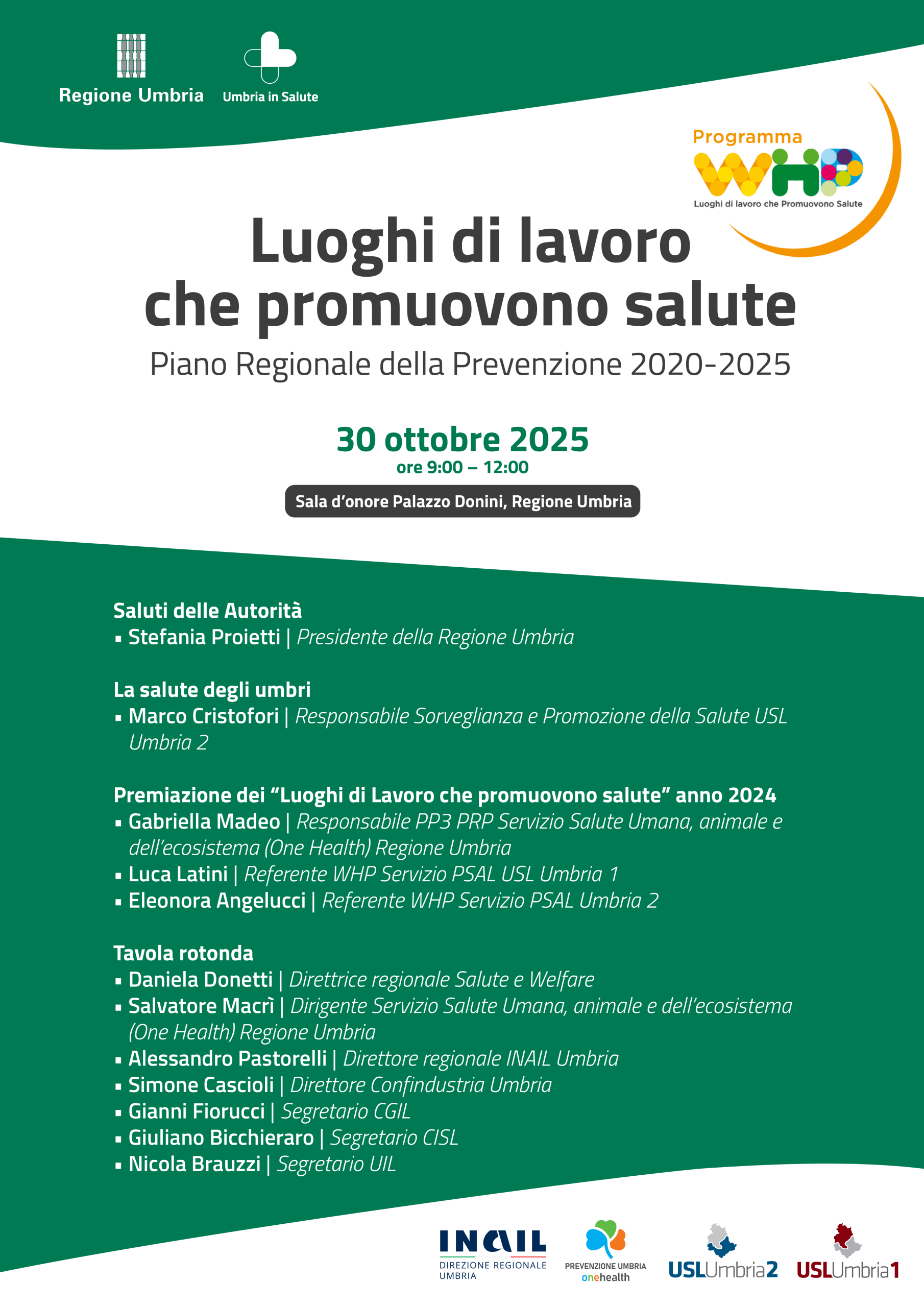(aun) – Perugia, 30 ottobre 2025 – La Regione Umbria ha riconosciuto l'impegno di 23 imprese del territorio che si sono distinte nell'ambito del programma regionale “luoghi di lavoro che promuovono salute” (pp03 del piano regionale della prevenzione) con una cerimonia tenutasi a Palazzo Donini alla presenza della presidente della Regione Umbria, Stefania Proietti, e della direttrice regionale alla Salute, Daniela Donetti, che hanno sottolineato l'importanza strategica della prevenzione e del benessere nei contesti produttivi.