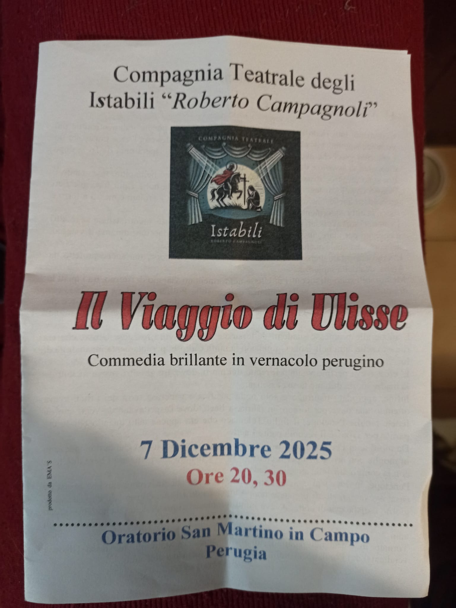 La troupe, domenica 7 dicembre, ha portato in scena Il viaggio di Ulisse, una commedia sulla storia del celeberrimo personaggio. Un Ulisse, però, totalmente nuovo, svuotato di ogni esuberanza, estroverso, pronto alla battuta e diseroicizzato rispetto alla versione omerica. Dietro questa rilettura troviamo ancora Antonella Ubaldi – scrittrice e storica che accompagna dal suo esordio la compagnia – e Fabio Bucigno, il quale si è occupato della regia della pièce. Ma ora, nel dettaglio, i due atti di questa ironica e moderna trasposizione, sempre caratterizzata dall'uso del vernacolo.