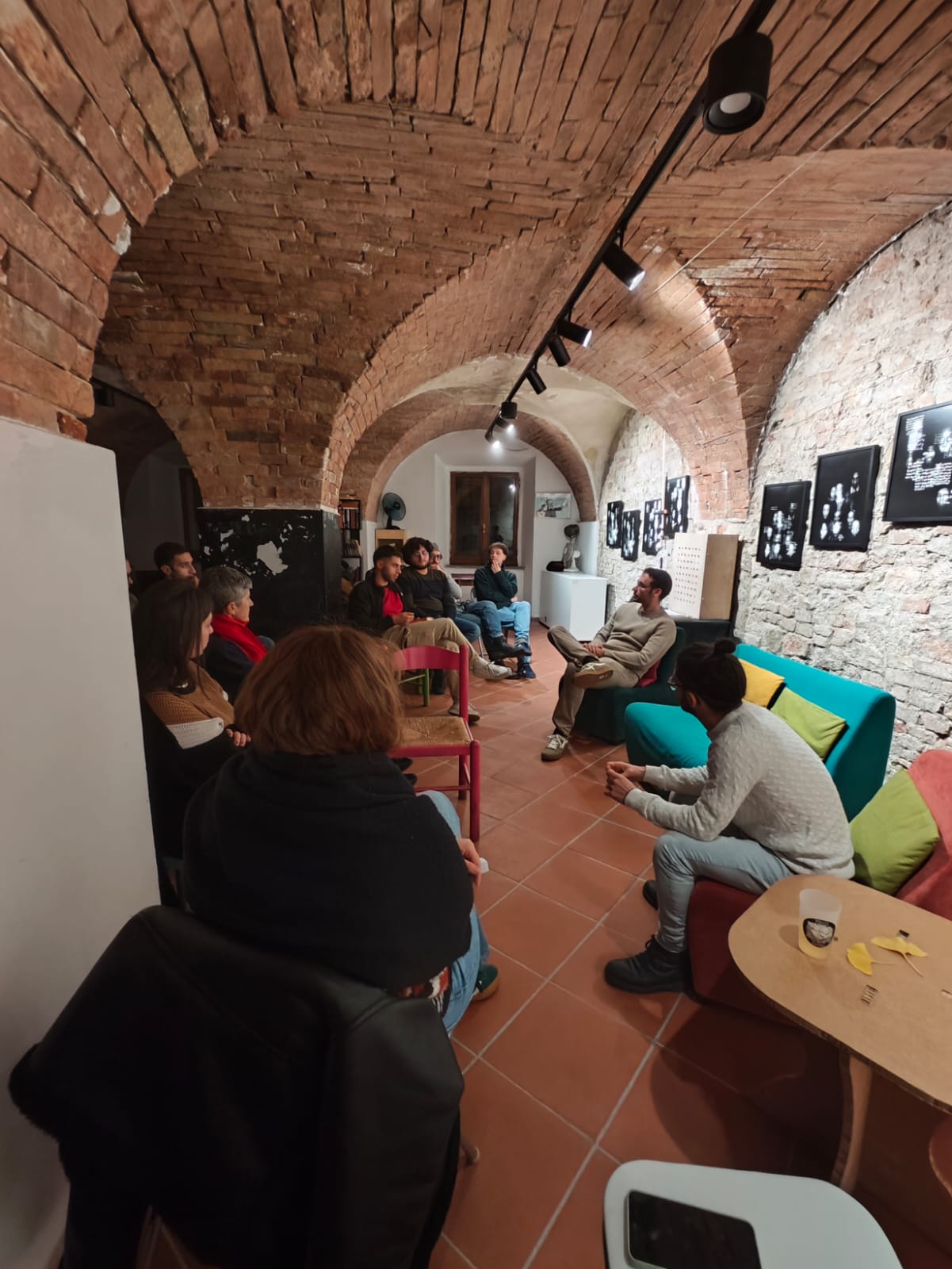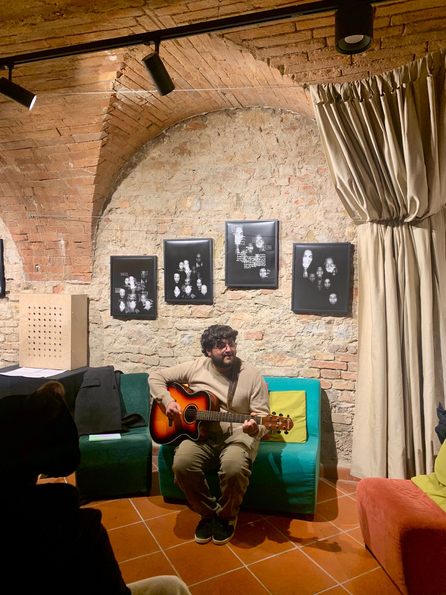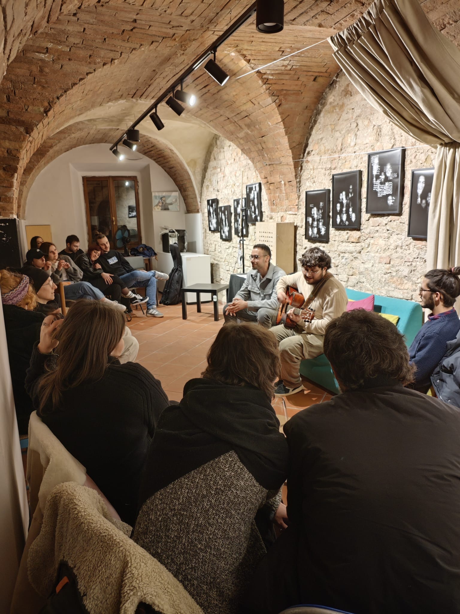 All’inizio è solo un piccolo atto di fiducia. Ci si presenta davanti a un portone antico senza una trama precisa in testa, con quell’attitudine sospesa che si riserva alle cose che non promettono nulla ma potrebbero restituire molto. Non si sa che forma prenderà la serata, né quanto si sarà chiamati in causa. Si sa soltanto che vale la pena attraversare quella soglia. Dentro, a Spazio Cult, le volte in mattoni custodiscono un’aria densa di familiarità e curiosità, come se le pareti avessero già visto passare molte parole prima delle nostre. Siamo a pochi passi dalle scalette vicino all’Università per Stranieri di Perugia, ma il tempo sembra rallentare. Le persone entrano alla spicciolata, si guardano, si siedono dove capita. Poi, quasi senza preavviso, Pietro, cantautore emergente con la chitarra, inaugura lo spazio con uno stornello improvviso, una specie di chiamata collettiva che mette in vibrazione la stanza. Subito dopo arrivano Elia e Matteo.