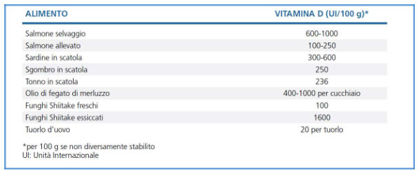Il fabbisogno di vitamina D è di 15 μg (1 μg di colecalciferolo = 40 UI vit. D). Il valore dell’assunzione raccomandata per la popolazione presente nei nuovi LARN, considera sia gli apporti alimentari sia la sintesi endogena nella cute. La vitamina D si trova nelle uova, nel latte e nel pesce azzurro.