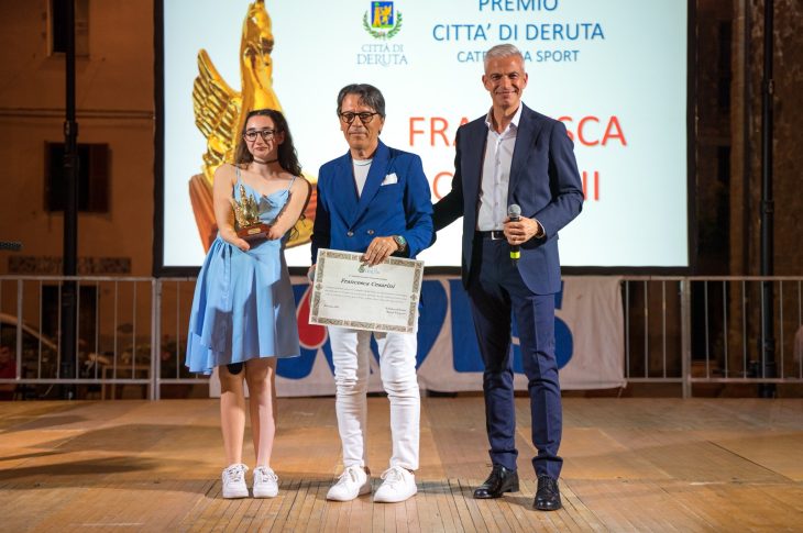 Poi è stata premiata Francesca Cesarini, diciottenne di Magione, nata con una condizione che le ha impedito lo sviluppo di mani e gamba destra. Per facilitare la deambulazione ha scelto di utilizzare solo una protesi alla gamba ma non alle braccia, ritenendole per lei limitanti. Nonostante queste difficoltà ha vinto nel 2021, a soli 14 anni, il campionato mondiale di para pole dance e nel 2023 il programma televisivo Italia’s Got Talent. Dopo aver dato merito ad Armando Marcucci per essere stato il promotore del calcio paralimpico in Umbria di cui dal 2023 ricopre anche il ruolo di delegato regionale per la FIGC DCPS (divisione calcio paralimpico e sperimentale), e a Nuvoletta Peraio, mamma di un’atleta che si è distinta per il fair play e per le iniziative svolte con tutti gli atleti al termine delle partite, il premio “Città di Deruta” è stato consegnato a Chiara Andidero, nuotatrice ventiduenne di Castiglione del Lago che all’età di sei anni ha scoperto di soffrire del disturbo dello spettro autistico. Andidero ha conquistato 29 titoli italiani in vasca corta e lunga, numerosi titoli regionali e ben 16 record italiani in diverse specialità oltre ad essere stata convocata per la prima volta in nazionale nel 2023. Molto bella anche la storia di Paolo Camanni, ventitreenne cinese che a seguito di un tumore che gli ha causato la cecità è stato abbandonato. Adottato da una famiglia di Bevagna dopo essere stato accolto da suore cattoliche, ha iniziato a praticare prima nuoto e poi judo. Proprio grazie a questo sport nell’ultimo triennio è riuscito a conquistare una medaglia d'oro agli Europei giovanili paralimpici in Finlandia e tre medaglie di bronzo tra Europei e Mondiali. Lo scorso settembre ha partecipato anche alle paralimpiadi di Parigi.