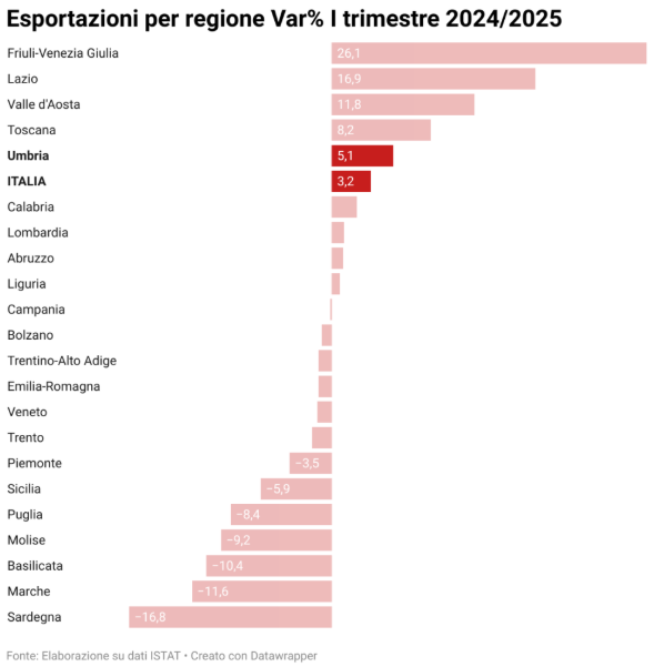 Ma come mai il sistema regionale non è in grado di assicurare un’occupazione di qualità, perdendo tanta parte della forza lavoro maggiormente qualificata e innovativa? Le analisi dell’AUR, Agenzia Umbra Ricerche che si occupa generalmente di argomenti socio-economici nella regione, ci suggeriscono una possibile soluzione: le aziende non sono abbastanza competitive, e questo a causa di una molteplicità di fattori, fra cui la loro dimensione, la loro capacità d’innovare, la loro connessione fisica e digitale con il mondo. Tuttavia non bisogna limitarci a osservare il presente, se si guarda al passato si nota come il sistema produttivo umbro, negli anni che vanno dal 2019 al 2023, sia stato capace di far crescere il proprio export di oltre il 25%, passando da 4,3 miliardi di euro a 5,6 miliardi in merci e servizi venduti all’estero. Gli esperti sono concordi nell’attribuzione di questo miglioramento a un aumento della produttività e della competitività. E questa crescita sembra continuare anche quest’anno, con una crescita dell’export che nel primo trimestre segnava una crescita del 7,9% secondo dati Istat.