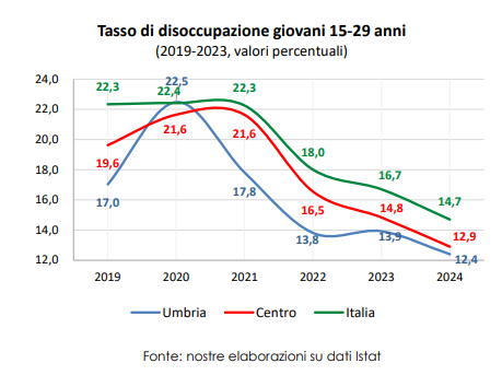 Ma qual è la situazione dell’occupazione dei giovani in Umbria? Gli ultimi dati 2024 ci dicono che la disoccupazione giovanile, cioè di tutti quelli compresi fra i 15 e di 29 anni, è scesa dal 17% di prima della pandemia di Covid al 12,4% nel 2024. Allo stesso modo la percentuale di NEET, ovvero di giovani fra i 15 e i 29 anni che non studiano né lavorano, è scesa dal 15% prima della pandemia al 10,5% della popolazione giovanile del 2024. Per entrambi gli indicatori il dato umbro è migliore sia del dato riguardante la zona centrale dell’Italia, sia della media nazionale.